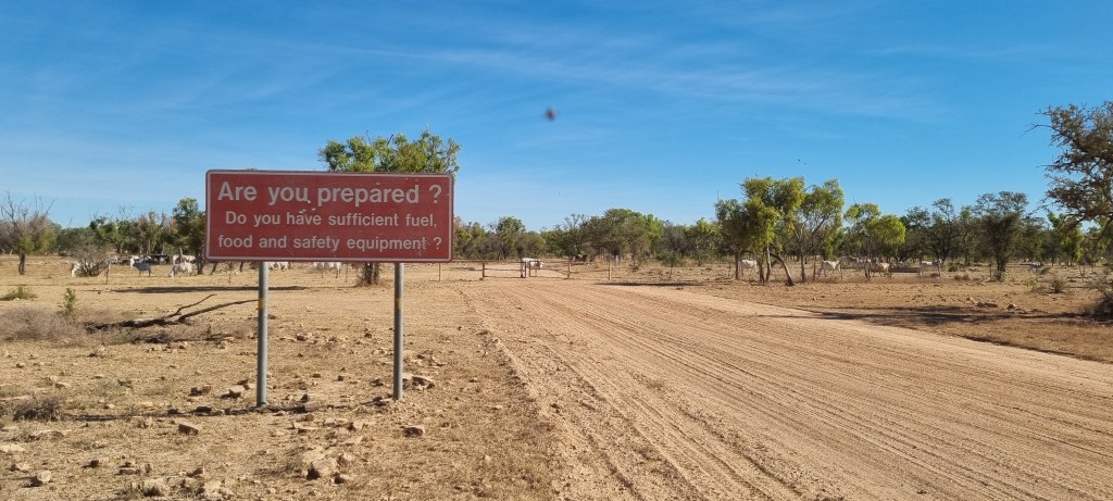 110 km The turn-off to Yarralin. You will come across a sign that during the wet, will advise 4WD tracks through Judbarra are closed. Shortly after, you’ll reach the turn-off to Yarralin, noted by all the signs, including the yellow one for Yarralin Store. Turn right here, and you come across a rather ominous “Are you prepared?” sign in front of the South Camel Paddock Gate. Open the gate, close it behind you, and continue on your way to Yarralin. You’ll also start to pickup mobile phone reception here (provided you’re with Telstra).